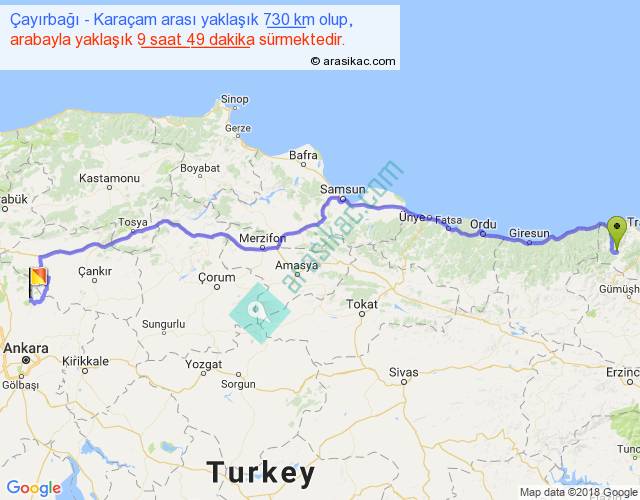 Çayırbağı - Karaçam arası yaklaşık olarak 90 km/h ile yukarıda belirtilen sürede olup, iki yerin kuş uçuşu uzaklığı (mesafesi) 541'dir. Eğer belirtilen yerler arasında uçak seferi var ise bu süre uçakla 49 dakika'ya kadar düşebilir. Yolculuk otobüsle 12 saat 45 dakika sürmektedir.