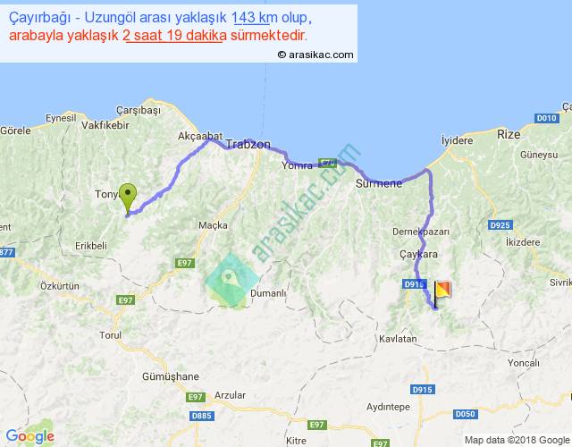 Çayırbağı - Uzungöl arası yaklaşık olarak 90 km/h ile yukarıda belirtilen sürede olup, iki yerin kuş uçuşu uzaklığı (mesafesi) 83'dir. Yolculuk otobüsle 3 saat 0 dakika sürmektedir.