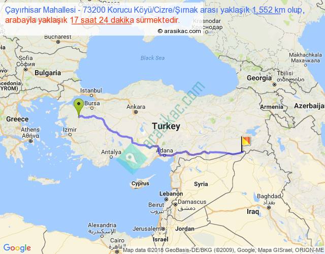 Çayırhisar Mahallesi - 73200 Korucu Köyü Cizre Şırnak arası yaklaşık olarak 90 km/h ile yukarıda belirtilen sürede olup, iki yerin kuş uçuşu uzaklığı (mesafesi) 1253'dir. Eğer belirtilen yerler arasında uçak seferi var ise bu süre uçakla 1 saat 55 dakika'ya kadar düşebilir. Yolculuk otobüsle 22 saat 37 dakika sürmektedir.