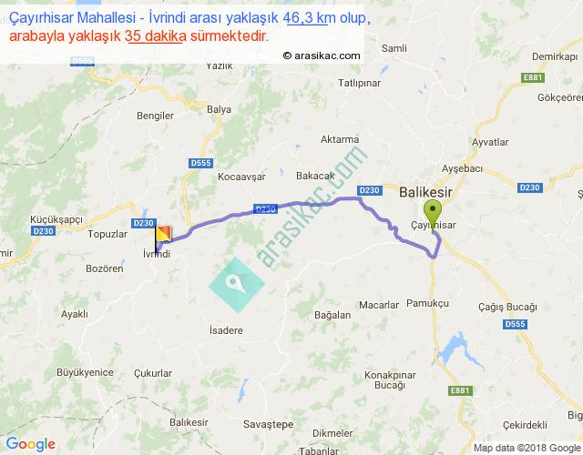 Çayırhisar Mahallesi - İvrindi arası yaklaşık olarak 90 km/h ile yukarıda belirtilen sürede olup, iki yerin kuş uçuşu uzaklığı (mesafesi) 36'dir. Yolculuk otobüsle 45 dakika sürmektedir.