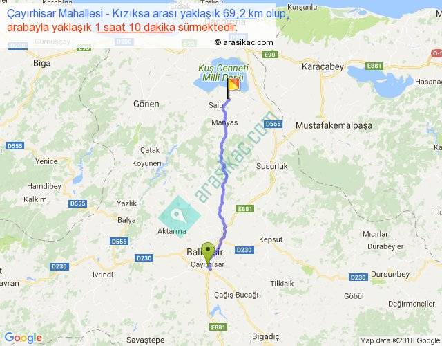 Çayırhisar Mahallesi - Kızıksa arası yaklaşık olarak 90 km/h ile yukarıda belirtilen sürede olup, iki yerin kuş uçuşu uzaklığı (mesafesi) 57'dir. Yolculuk otobüsle 1 saat 31 dakika sürmektedir.