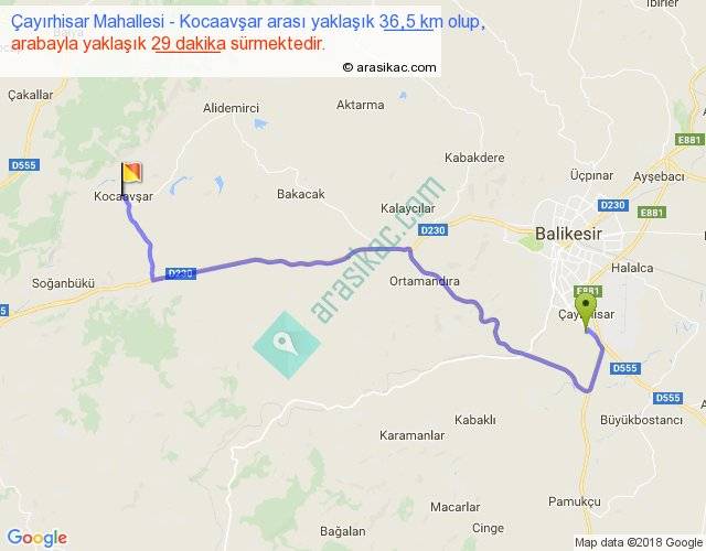 Çayırhisar Mahallesi - Kocaavşar arası yaklaşık olarak 90 km/h ile yukarıda belirtilen sürede olup, iki yerin kuş uçuşu uzaklığı (mesafesi) 26'dir. Yolculuk otobüsle 37 dakika sürmektedir.