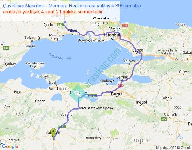 Çayırhisar Mahallesi - Marmara Region arası yaklaşık olarak 90 km/h ile yukarıda belirtilen sürede olup, iki yerin kuş uçuşu uzaklığı (mesafesi) 183'dir. Yolculuk otobüsle 5 saat 39 dakika sürmektedir.