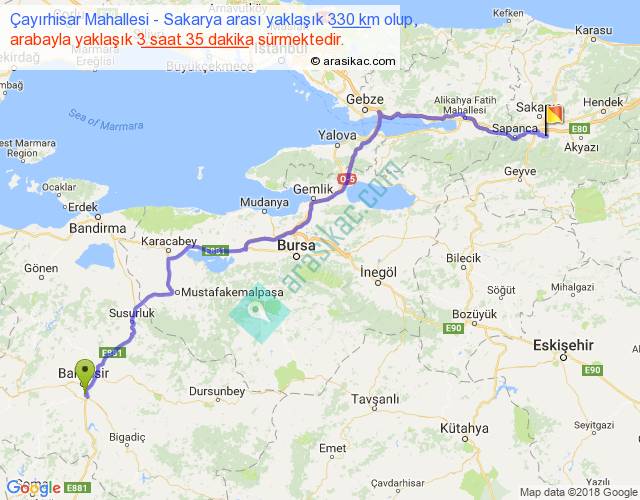 Çayırhisar Mahallesi - Sakarya arası yaklaşık olarak 90 km/h ile yukarıda belirtilen sürede olup, iki yerin kuş uçuşu uzaklığı (mesafesi) 246'dir. Yolculuk otobüsle 4 saat 39 dakika sürmektedir.