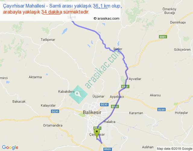 Çayırhisar Mahallesi - Samli arası yaklaşık olarak 90 km/h ile yukarıda belirtilen sürede olup, iki yerin kuş uçuşu uzaklığı (mesafesi) 24'dir. Yolculuk otobüsle 44 dakika sürmektedir.