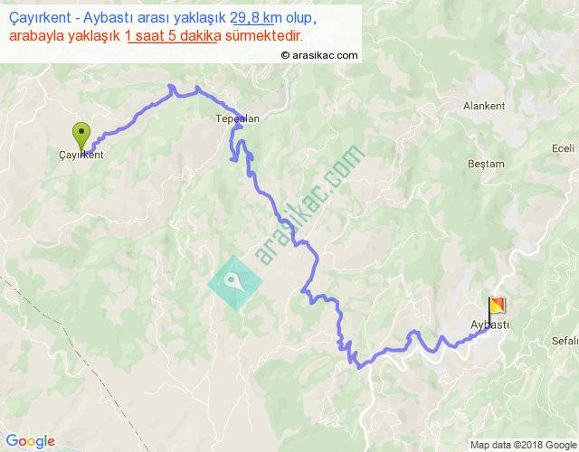 Çayırkent - Aybastı arası yaklaşık olarak 90 km/h ile yukarıda belirtilen sürede olup, iki yerin kuş uçuşu uzaklığı (mesafesi) 14'dir. Yolculuk otobüsle 1 saat 24 dakika sürmektedir.