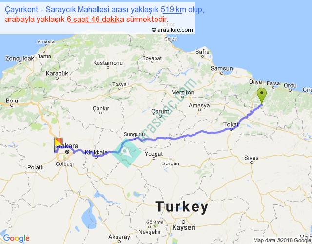 Çayırkent - Saraycık Mahallesi arası yaklaşık olarak 90 km/h ile yukarıda belirtilen sürede olup, iki yerin kuş uçuşu uzaklığı (mesafesi) 403'dir. Eğer belirtilen yerler arasında uçak seferi var ise bu süre uçakla 37 dakika'ya kadar düşebilir. Yolculuk otobüsle 8 saat 47 dakika sürmektedir.