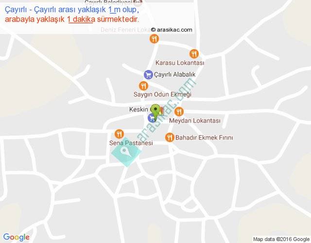 Çayırlı - Çayırlı arası yaklaşık olarak 90 km/h ile yukarıda belirtilen sürede olup, iki yerin kuş uçuşu uzaklığı (mesafesi) 0'dir. Yolculuk otobüsle 1 dakika sürmektedir.