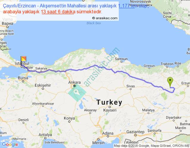 Çayırlı Erzincan - Akşemsettin Mahallesi arası yaklaşık olarak 90 km/h ile yukarıda belirtilen sürede olup, iki yerin kuş uçuşu uzaklığı (mesafesi) 937'dir. Eğer belirtilen yerler arasında uçak seferi var ise bu süre uçakla 1 saat 26 dakika'ya kadar düşebilir. Yolculuk otobüsle 17 saat 1 dakika sürmektedir.