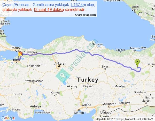 Çayırlı Erzincan - Gemlik arası yaklaşık olarak 90 km/h ile yukarıda belirtilen sürede olup, iki yerin kuş uçuşu uzaklığı (mesafesi) 914'dir. Eğer belirtilen yerler arasında uçak seferi var ise bu süre uçakla 1 saat 24 dakika'ya kadar düşebilir. Yolculuk otobüsle 16 saat 39 dakika sürmektedir.