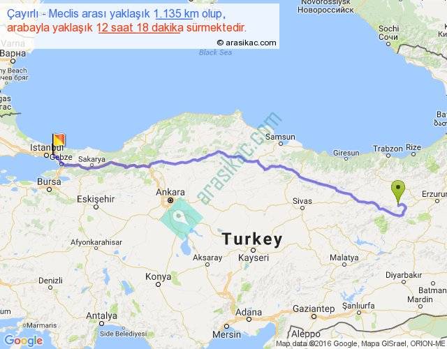 Çayırlı - Meclis arası yaklaşık olarak 90 km/h ile yukarıda belirtilen sürede olup, iki yerin kuş uçuşu uzaklığı (mesafesi) 921'dir. Eğer belirtilen yerler arasında uçak seferi var ise bu süre uçakla 1 saat 25 dakika'ya kadar düşebilir. Yolculuk otobüsle 15 saat 59 dakika sürmektedir.