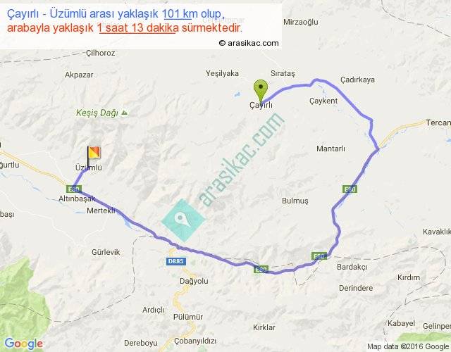 Çayırlı - Üzümlü arası yaklaşık olarak 90 km/h ile yukarıda belirtilen sürede olup, iki yerin kuş uçuşu uzaklığı (mesafesi) 30'dir. Yolculuk otobüsle 1 saat 34 dakika sürmektedir.