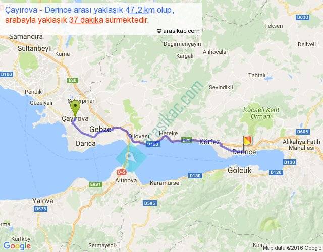 Çayırova - Derince arası yaklaşık olarak 90 km/h ile yukarıda belirtilen sürede olup, iki yerin kuş uçuşu uzaklığı (mesafesi) 39'dir. Yolculuk otobüsle 48 dakika sürmektedir.