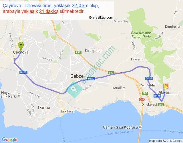 Çayırova - Dilovası arası yaklaşık olarak 90 km/h ile yukarıda belirtilen sürede olup, iki yerin kuş uçuşu uzaklığı (mesafesi) 15'dir. Yolculuk otobüsle 27 dakika sürmektedir.
