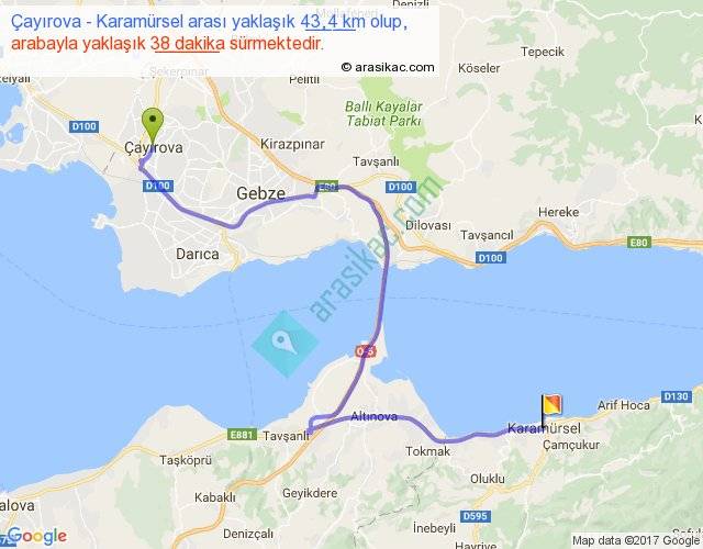 Çayırova - Karamürsel arası yaklaşık olarak 90 km/h ile yukarıda belirtilen sürede olup, iki yerin kuş uçuşu uzaklığı (mesafesi) 25'dir. Yolculuk otobüsle 50 dakika sürmektedir.