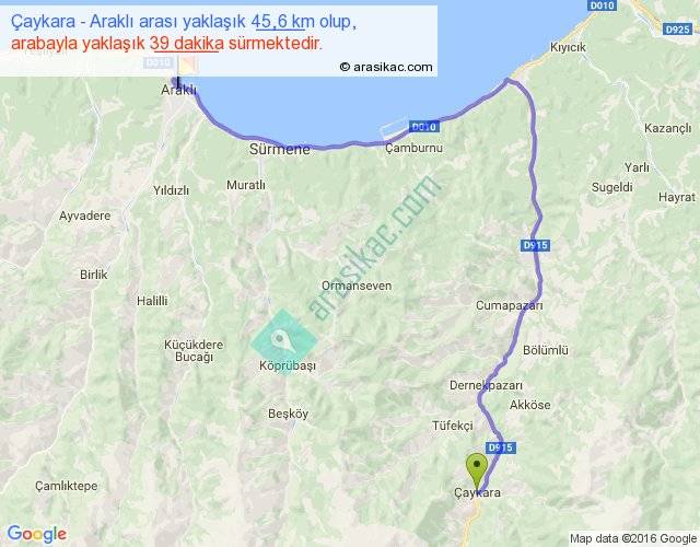 Çaykara - Araklı arası yaklaşık olarak 90 km/h ile yukarıda belirtilen sürede olup, iki yerin kuş uçuşu uzaklığı (mesafesi) 26'dir. Yolculuk otobüsle 50 dakika sürmektedir.