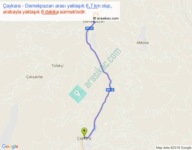 Çaykara - Dernekpazarı arası yaklaşık olarak 90 km/h ile yukarıda belirtilen sürede olup, iki yerin kuş uçuşu uzaklığı (mesafesi) 6'dir. Yolculuk otobüsle 10 dakika sürmektedir.