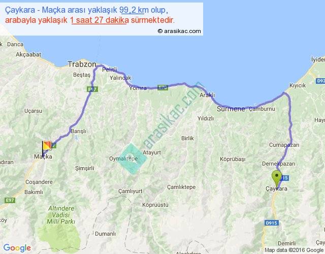 Çaykara - Maçka arası yaklaşık olarak 90 km/h ile yukarıda belirtilen sürede olup, iki yerin kuş uçuşu uzaklığı (mesafesi) 53'dir. Yolculuk otobüsle 1 saat 53 dakika sürmektedir.