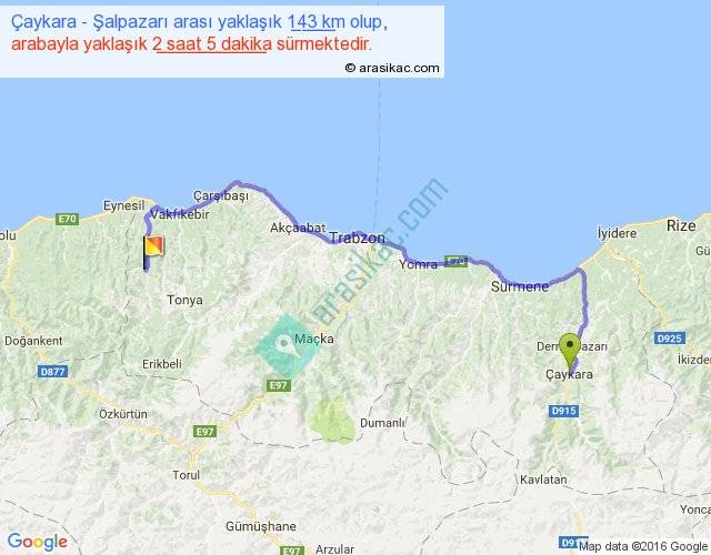 Çaykara - Şalpazarı arası yaklaşık olarak 90 km/h ile yukarıda belirtilen sürede olup, iki yerin kuş uçuşu uzaklığı (mesafesi) 90'dir. Yolculuk otobüsle 2 saat 42 dakika sürmektedir.