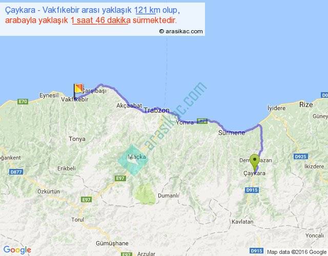 Çaykara - Vakfıkebir arası yaklaşık olarak 90 km/h ile yukarıda belirtilen sürede olup, iki yerin kuş uçuşu uzaklığı (mesafesi) 87'dir. Yolculuk otobüsle 2 saat 17 dakika sürmektedir.