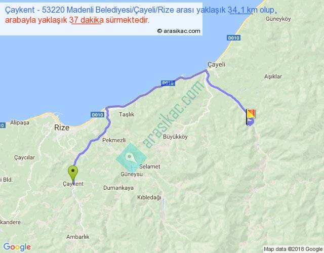 Çaykent - 53220 Madenli Belediyesi Çayeli Rize arası yaklaşık olarak 90 km/h ile yukarıda belirtilen sürede olup, iki yerin kuş uçuşu uzaklığı (mesafesi) 21'dir. Yolculuk otobüsle 48 dakika sürmektedir.