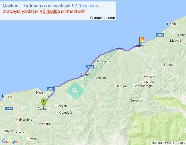 Çaykent - Ardeşen arası yaklaşık olarak 90 km/h ile yukarıda belirtilen sürede olup, iki yerin kuş uçuşu uzaklığı (mesafesi) 45'dir. Yolculuk otobüsle 58 dakika sürmektedir.