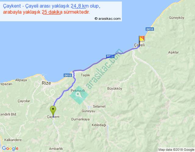 Çaykent - Çayeli arası yaklaşık olarak 90 km/h ile yukarıda belirtilen sürede olup, iki yerin kuş uçuşu uzaklığı (mesafesi) 21'dir. Yolculuk otobüsle 32 dakika sürmektedir.
