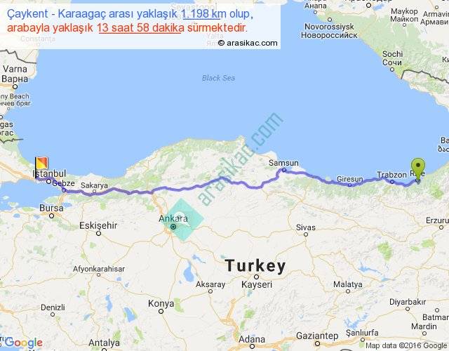 Çaykent - Karaagaç arası yaklaşık olarak 90 km/h ile yukarıda belirtilen sürede olup, iki yerin kuş uçuşu uzaklığı (mesafesi) 996'dir. Eğer belirtilen yerler arasında uçak seferi var ise bu süre uçakla 1 saat 31 dakika'ya kadar düşebilir. Yolculuk otobüsle 18 saat 9 dakika sürmektedir.