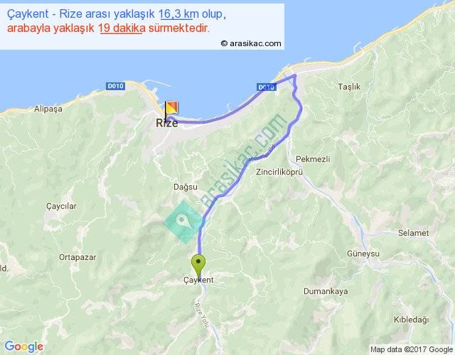 Çaykent - Rize arası yaklaşık olarak 90 km/h ile yukarıda belirtilen sürede olup, iki yerin kuş uçuşu uzaklığı (mesafesi) 6'dir. Yolculuk otobüsle 24 dakika sürmektedir.