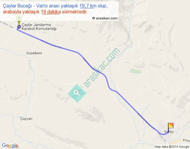 Çaylar Bucağı - Varto arası yaklaşık olarak 90 km/h ile yukarıda belirtilen sürede olup, iki yerin kuş uçuşu uzaklığı (mesafesi) 18'dir. Yolculuk otobüsle 24 dakika sürmektedir.