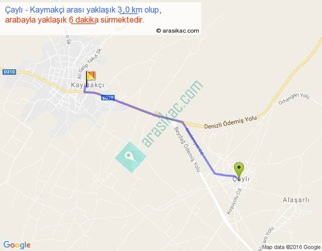 Çaylı - Kaymakçi arası yaklaşık olarak 90 km/h ile yukarıda belirtilen sürede olup, iki yerin kuş uçuşu uzaklığı (mesafesi) 3'dir. Yolculuk otobüsle 7 dakika sürmektedir.