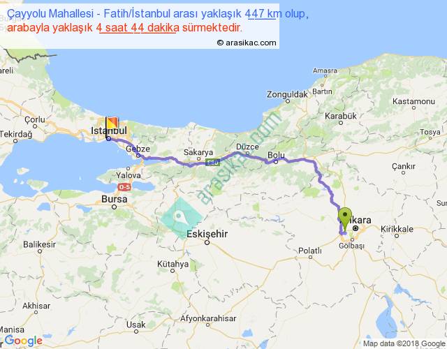 Çayyolu Mahallesi - Fatih İstanbul arası yaklaşık olarak 90 km/h ile yukarıda belirtilen sürede olup, iki yerin kuş uçuşu uzaklığı (mesafesi) 340'dir. Eğer belirtilen yerler arasında uçak seferi var ise bu süre uçakla 31 dakika'ya kadar düşebilir. Yolculuk otobüsle 6 saat 9 dakika sürmektedir.
