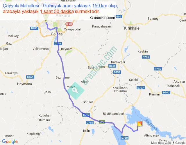 Çayyolu Mahallesi - Gülhüyük arası yaklaşık olarak 90 km/h ile yukarıda belirtilen sürede olup, iki yerin kuş uçuşu uzaklığı (mesafesi) 114'dir. Yolculuk otobüsle 2 saat 23 dakika sürmektedir.