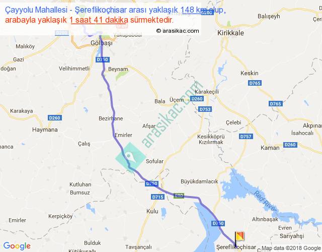 Çayyolu Mahallesi - Şereflikoçhisar arası yaklaşık olarak 90 km/h ile yukarıda belirtilen sürede olup, iki yerin kuş uçuşu uzaklığı (mesafesi) 127'dir. Yolculuk otobüsle 2 saat 11 dakika sürmektedir.