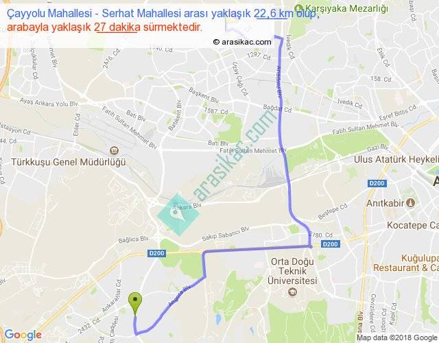 Çayyolu Mahallesi - Serhat Mahallesi arası yaklaşık olarak 90 km/h ile yukarıda belirtilen sürede olup, iki yerin kuş uçuşu uzaklığı (mesafesi) 13'dir. Yolculuk otobüsle 35 dakika sürmektedir.