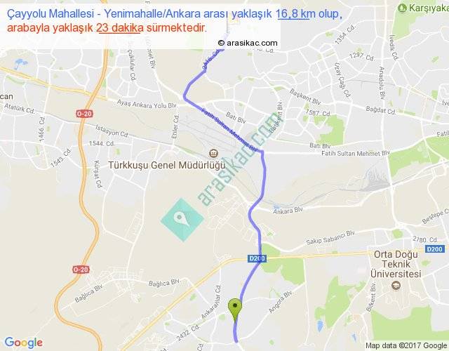 Çayyolu Mahallesi - Yenimahalle Ankara arası yaklaşık olarak 90 km/h ile yukarıda belirtilen sürede olup, iki yerin kuş uçuşu uzaklığı (mesafesi) 12'dir. Yolculuk otobüsle 29 dakika sürmektedir.