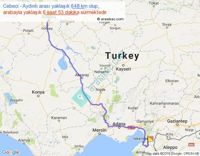 Cebeci - Aydınlı arası yaklaşık olarak 90 km/h ile yukarıda belirtilen sürede olup, iki yerin kuş uçuşu uzaklığı (mesafesi) 486'dir. Eğer belirtilen yerler arasında uçak seferi var ise bu süre uçakla 44 dakika'ya kadar düşebilir. Yolculuk otobüsle 8 saat 56 dakika sürmektedir.