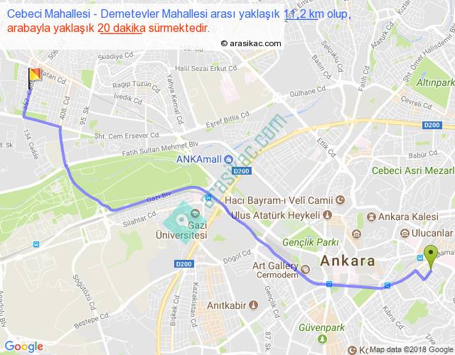 Cebeci Mahallesi - Demetevler Mahallesi arası yaklaşık olarak 90 km/h ile yukarıda belirtilen sürede olup, iki yerin kuş uçuşu uzaklığı (mesafesi) 9'dir. Yolculuk otobüsle 26 dakika sürmektedir.