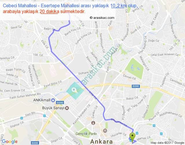 Cebeci Mahallesi - Esertepe Mahallesi arası yaklaşık olarak 90 km/h ile yukarıda belirtilen sürede olup, iki yerin kuş uçuşu uzaklığı (mesafesi) 7'dir. Yolculuk otobüsle 26 dakika sürmektedir.