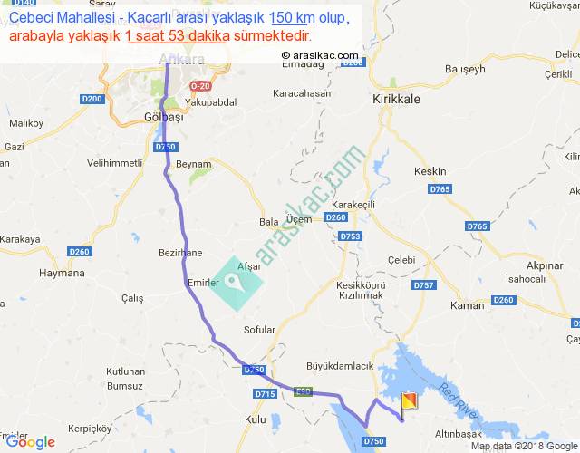 Cebeci Mahallesi - Kacarlı arası yaklaşık olarak 90 km/h ile yukarıda belirtilen sürede olup, iki yerin kuş uçuşu uzaklığı (mesafesi) 108'dir. Yolculuk otobüsle 2 saat 26 dakika sürmektedir.