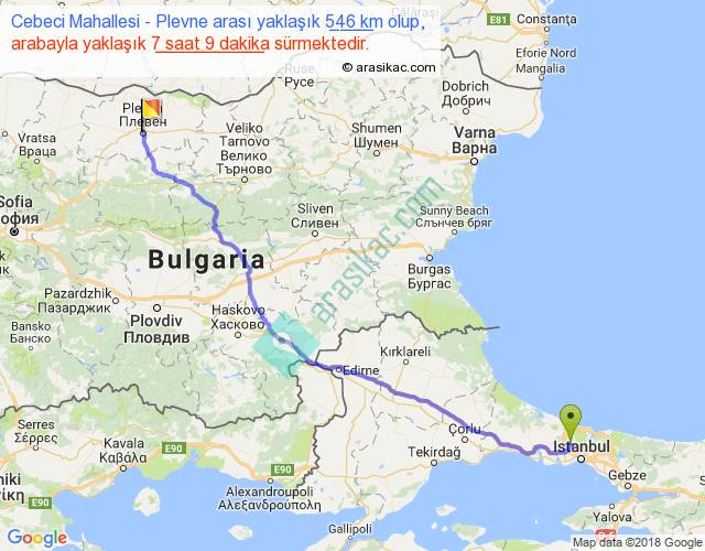 Cebeci Mahallesi - Plevne arası yaklaşık olarak 90 km/h ile yukarıda belirtilen sürede olup, iki yerin kuş uçuşu uzaklığı (mesafesi) 432'dir. Eğer belirtilen yerler arasında uçak seferi var ise bu süre uçakla 39 dakika'ya kadar düşebilir. Yolculuk otobüsle 9 saat 17 dakika sürmektedir.