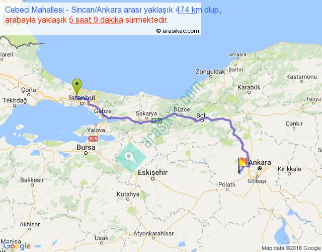 Cebeci Mahallesi - Sincan Ankara arası yaklaşık olarak 90 km/h ile yukarıda belirtilen sürede olup, iki yerin kuş uçuşu uzaklığı (mesafesi) 329'dir. Eğer belirtilen yerler arasında uçak seferi var ise bu süre uçakla 30 dakika'ya kadar düşebilir. Yolculuk otobüsle 6 saat 41 dakika sürmektedir.