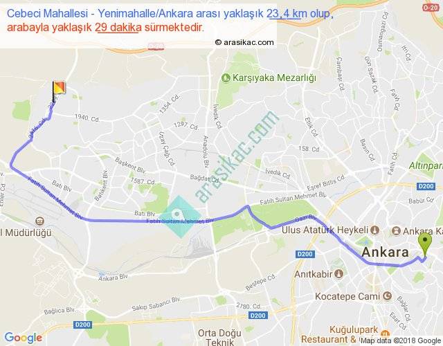 Cebeci Mahallesi - Yenimahalle Ankara arası yaklaşık olarak 90 km/h ile yukarıda belirtilen sürede olup, iki yerin kuş uçuşu uzaklığı (mesafesi) 17'dir. Yolculuk otobüsle 37 dakika sürmektedir.