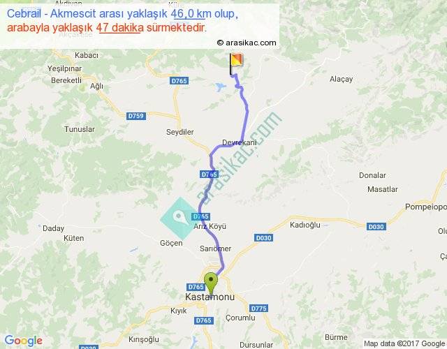 Cebrail - Akmescit arası yaklaşık olarak 90 km/h ile yukarıda belirtilen sürede olup, iki yerin kuş uçuşu uzaklığı (mesafesi) 36'dir. Yolculuk otobüsle 1 saat 1 dakika sürmektedir.