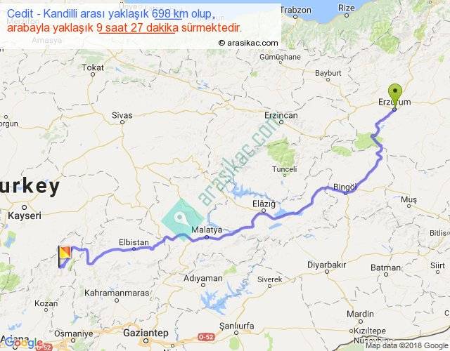 Cedit - Kandilli arası yaklaşık olarak 90 km/h ile yukarıda belirtilen sürede olup, iki yerin kuş uçuşu uzaklığı (mesafesi) 498'dir. Eğer belirtilen yerler arasında uçak seferi var ise bu süre uçakla 45 dakika'ya kadar düşebilir. Yolculuk otobüsle 12 saat 17 dakika sürmektedir.