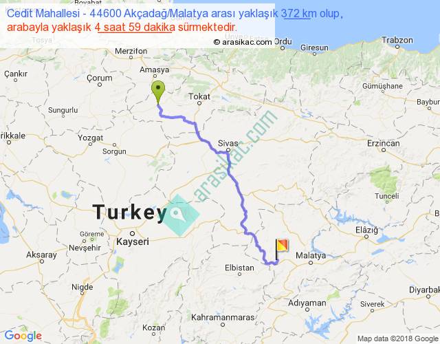 Cedit Mahallesi - 44600 Akçadağ Malatya arası yaklaşık olarak 90 km/h ile yukarıda belirtilen sürede olup, iki yerin kuş uçuşu uzaklığı (mesafesi) 267'dir. Eğer belirtilen yerler arasında uçak seferi var ise bu süre uçakla 24 dakika'ya kadar düşebilir. Yolculuk otobüsle 6 saat 28 dakika sürmektedir.
