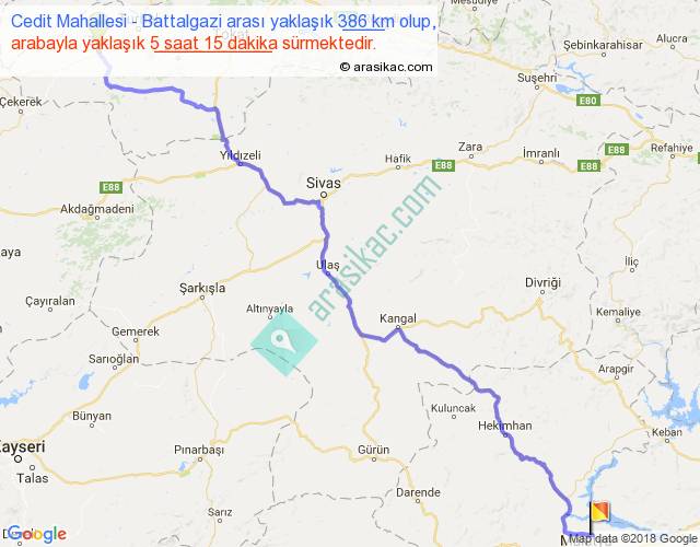 Cedit Mahallesi - Battalgazi arası yaklaşık olarak 90 km/h ile yukarıda belirtilen sürede olup, iki yerin kuş uçuşu uzaklığı (mesafesi) 296'dir. Eğer belirtilen yerler arasında uçak seferi var ise bu süre uçakla 27 dakika'ya kadar düşebilir. Yolculuk otobüsle 6 saat 49 dakika sürmektedir.