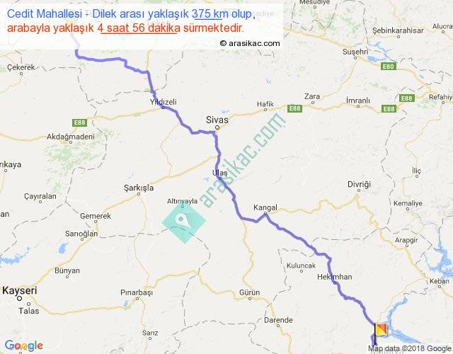 Cedit Mahallesi - Dilek arası yaklaşık olarak 90 km/h ile yukarıda belirtilen sürede olup, iki yerin kuş uçuşu uzaklığı (mesafesi) 288'dir. Eğer belirtilen yerler arasında uçak seferi var ise bu süre uçakla 26 dakika'ya kadar düşebilir. Yolculuk otobüsle 6 saat 24 dakika sürmektedir.