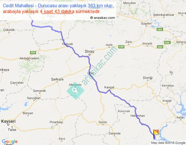 Cedit Mahallesi - Durucasu arası yaklaşık olarak 90 km/h ile yukarıda belirtilen sürede olup, iki yerin kuş uçuşu uzaklığı (mesafesi) 281'dir. Eğer belirtilen yerler arasında uçak seferi var ise bu süre uçakla 25 dakika'ya kadar düşebilir. Yolculuk otobüsle 6 saat 7 dakika sürmektedir.
