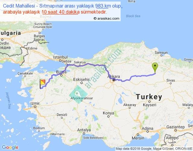 Cedit Mahallesi - Sıtmapınar arası yaklaşık olarak 90 km/h ile yukarıda belirtilen sürede olup, iki yerin kuş uçuşu uzaklığı (mesafesi) 714'dir. Eğer belirtilen yerler arasında uçak seferi var ise bu süre uçakla 1 saat 05 dakika'ya kadar düşebilir. Yolculuk otobüsle 13 saat 52 dakika sürmektedir.